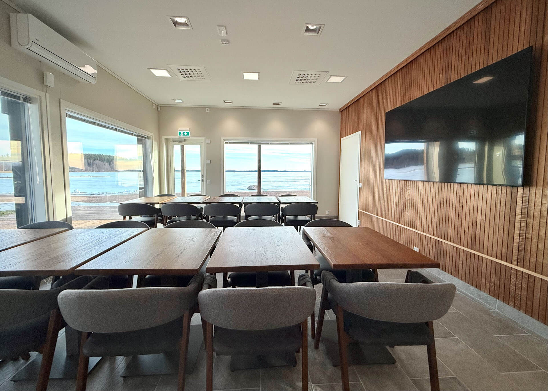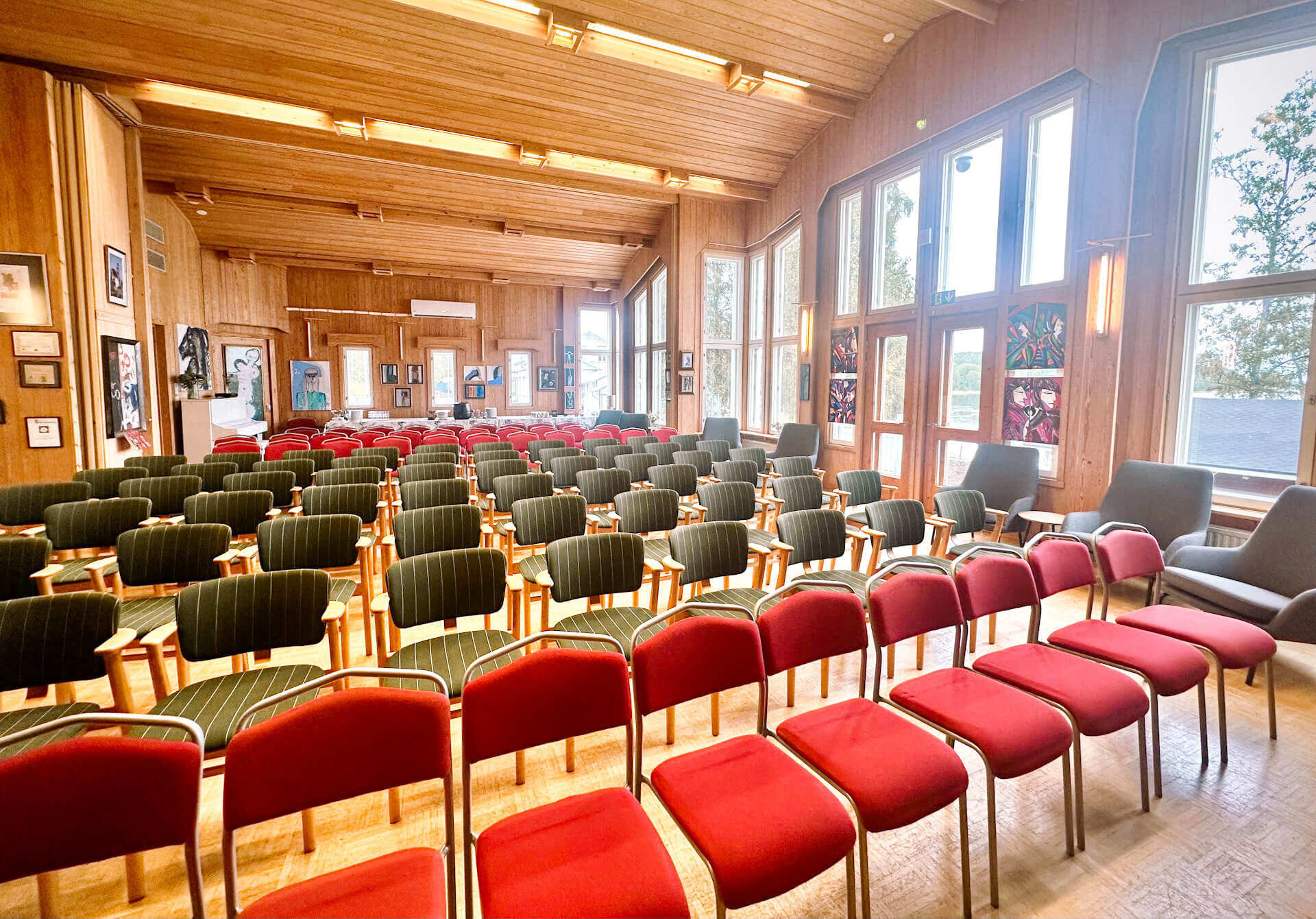 Valoisa, korkeakattoinen kokous- ja juhlatila järvinäkymällä