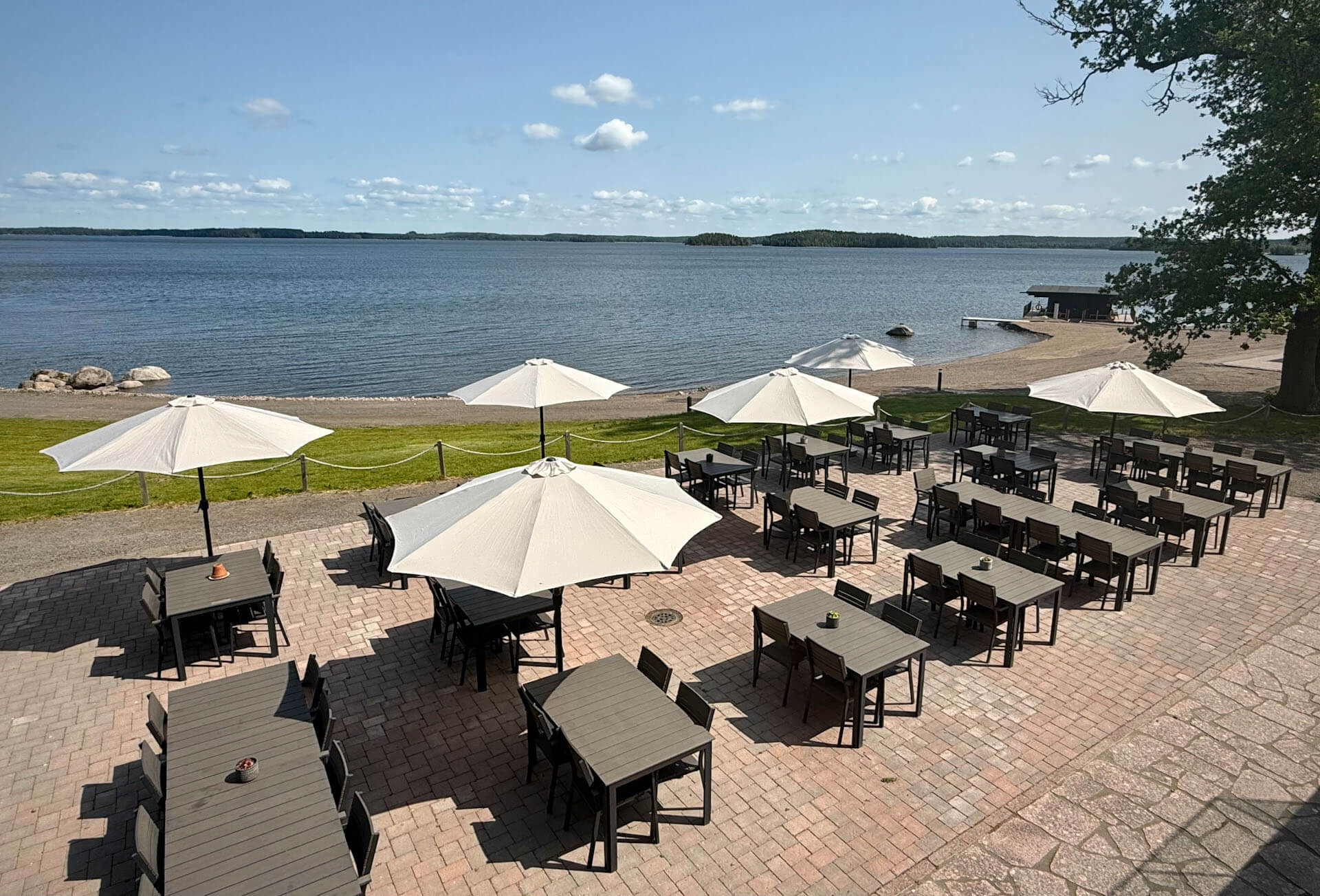 Buffet-tarjoilut ja aamiainen järjestetään ravintolan salin yhteydessä olevaan aamiaishuoneeseen. Ravintolan tasalla on kattamaton 30 hengen kesäterassi ja maantasalla 100-paikkainen rantaterassi.