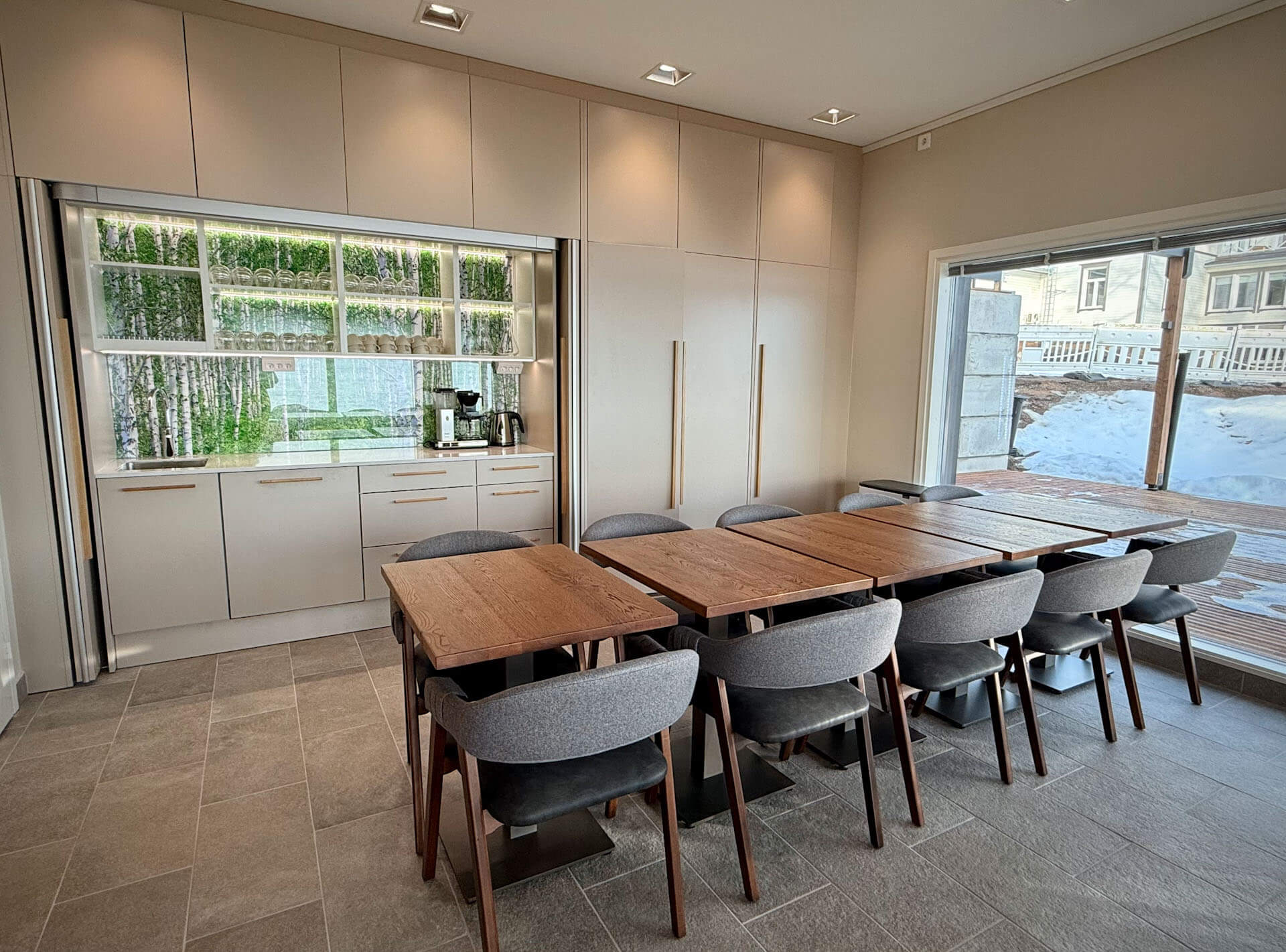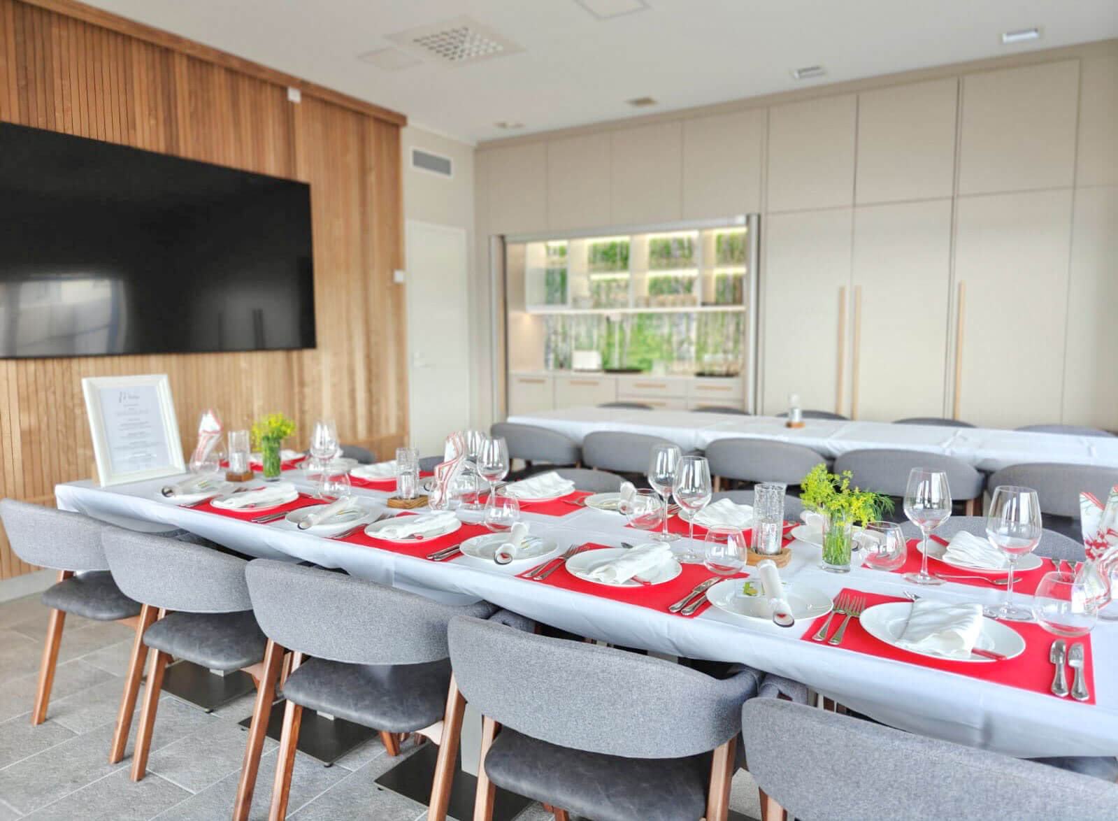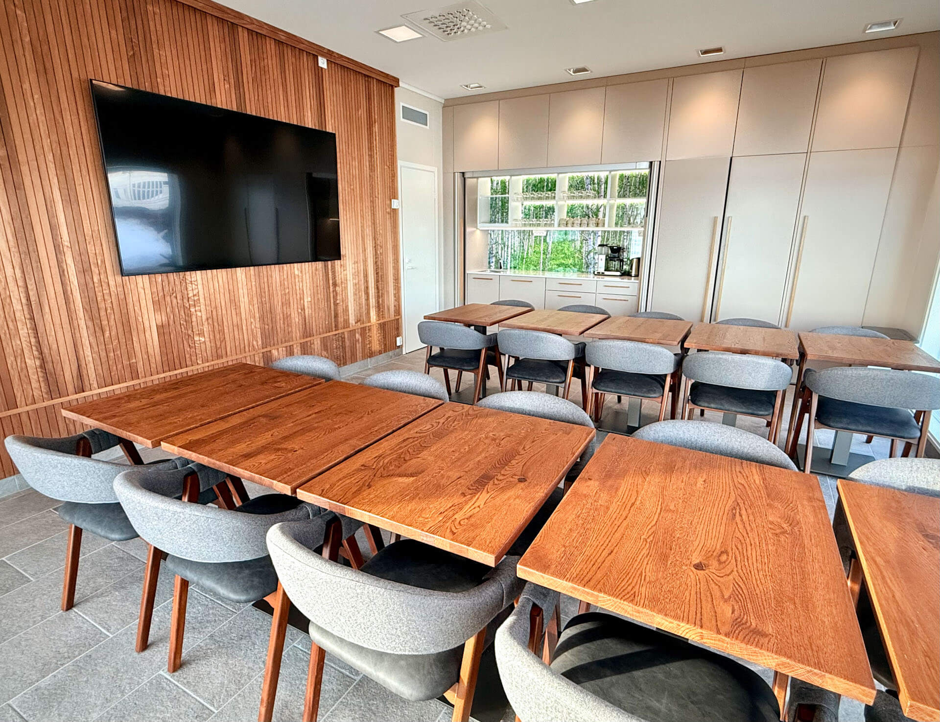 Kabinetista löytyy iso näyttö langattomalla liittimellä, joka tekee esitysten ja viihteen jakamisesta vaivatonta. Lisäksi tilassa on keittiönurkkaus sekä tuolit ja pöydät 20 hengelle, mikä mahdollistaa monenlaiset tilaisuudet.