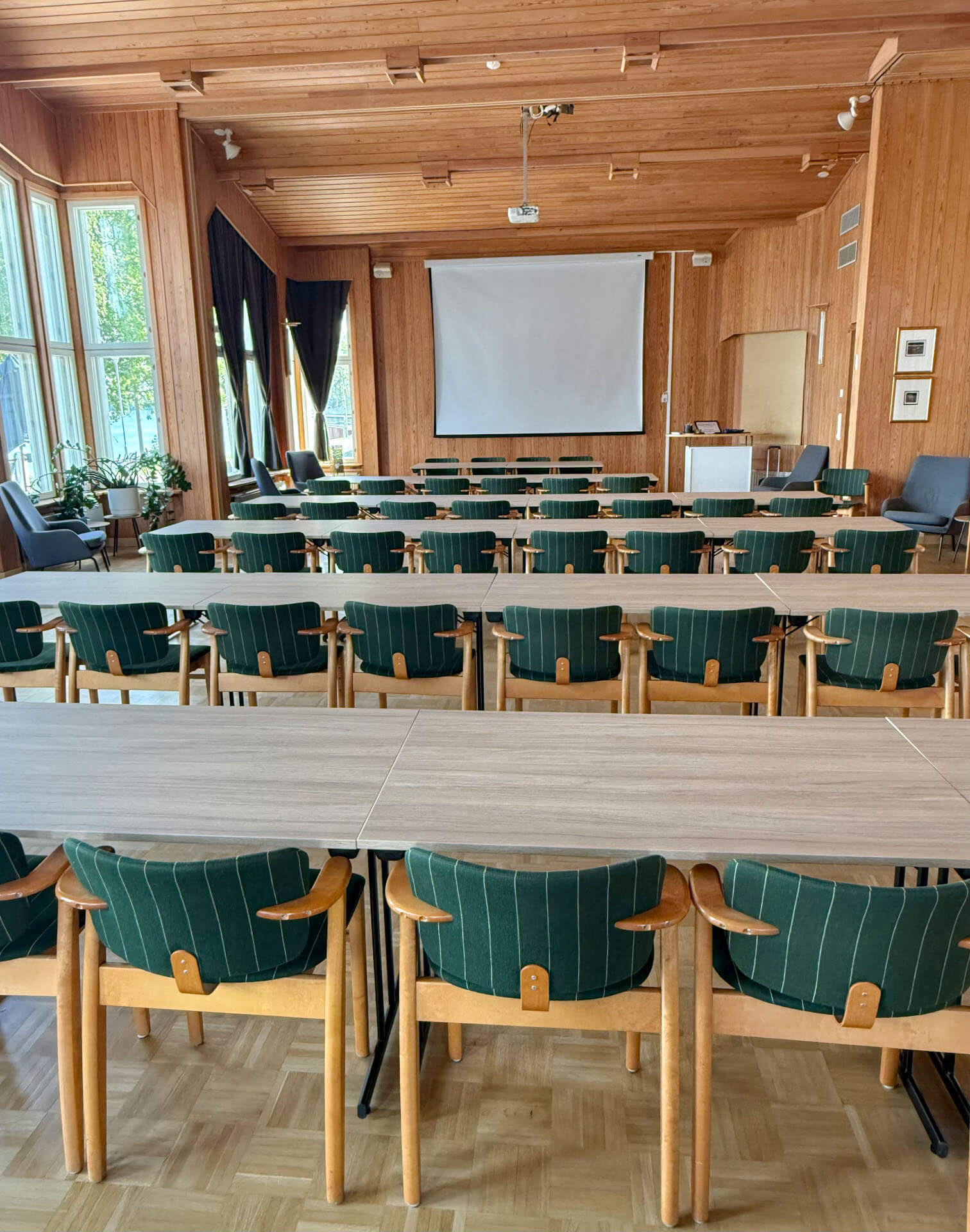 Tilassa on kiinteät valkokankaat tilan molemmissa päissä