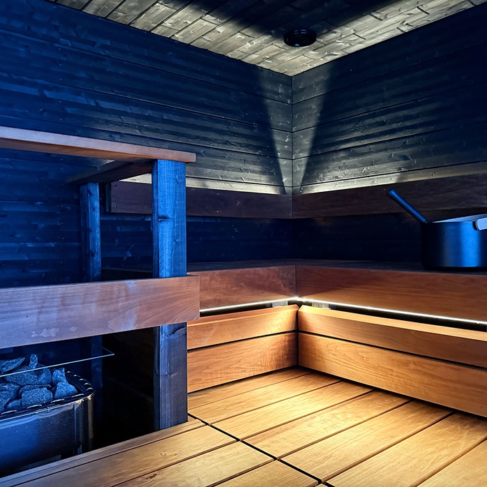Lauttasauna toimii elämyksellisenä löylyhuoneena, josta pääsee suoraan uimaan lauttaterassin portaita pitkin.